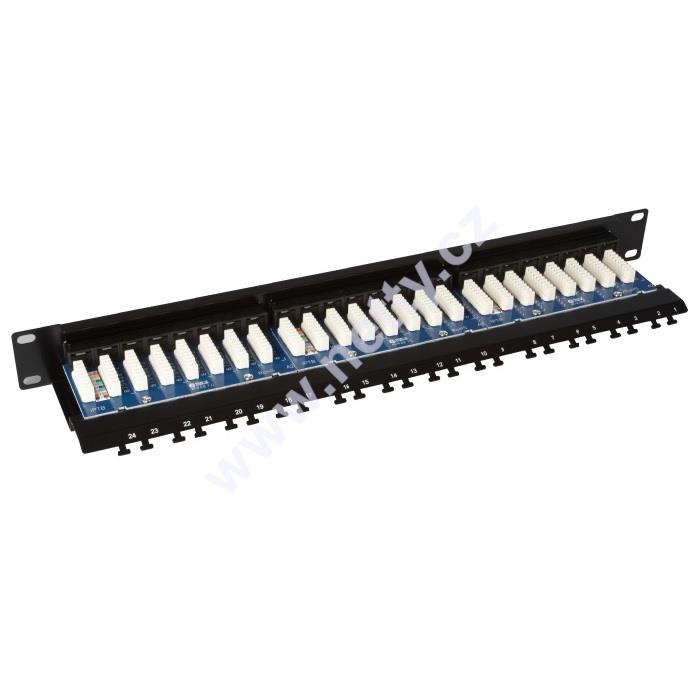 Patch panel Solarix s označením SX24L-5E-UTP-BK je panel osazený 24 porty RJ45, jehož součástí je vyvazovací lišta sloužící k pevnému uchycení a přehlednému uspořádání kabelů. Datový kabel se zakončuje do duální IDC svorkovnice typu 110/Krone – tj. k zařezání lze použít nástroj typu 110 i Krone. Svorkovnice je z důvodu snadného zakončení kabelu označena podle standardu T568A i T568B, a to za pomoci barev párů a číselného označení jednotlivých vodičů přímo na desce plošných spojů (liché číslo označuje vždy polobarevný vodič a sudé plně barevný). Stejně jako všechny ostatní komponenty strukturované kabeláže Solarix je tento panel vyroben tak, aby zaručoval maximální životnost, velmi dobrou funkčnost a především vysokou spolehlivost. Tento patch panel Solarix splňuje požadavky na komponenty CAT5E definované ve standardech TIA/EIA 568, EN 50173 a ISO 11801. Barva patch panelu je černá; velikost v datovém rozvaděči je 1U.