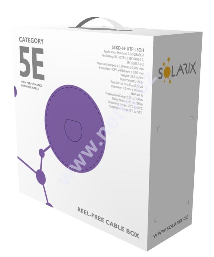 Tento Instalační kabel Solarix s označením SXKD-5E-UTP-LSOH je spolehlivý nestíněný kabel kategorie 5E, který je testován až do šířky pásma 350 MHz, a určen pro provoz Ethernetových protokolů, včetně 2.5GBASE-T a 5GBASE-T*. Konstrukce kabelu je U/UTP, typ pláště LSOH s třídou reakce na oheň Dca-s1,d2,a1. Vodiče kabelu jsou vyrobeny z kvalitního měděného drátu s čistotou mědi 99,97%. Kabel bez problémů splňuje požadavky z mezinárodních standardů ISO/IEC 11801, EN 50173 a ANSI/TIA 568.2-D. Výkonové parametry tohoto kabelu byly otestovány nezávislou testovací zkušebnou FORCE TECHNOLOGY v rámci programu EC Verified, a to na nejvyšší úroveň tzv. Component Level. Certifikát je k dispozici zde na webu v záložce "Soubory ke stažení" nebo přímo na stránkách laboratoře FORCE. V případě CPR (nařízení EU č. 305/2011) je kabel testován v systému posuzování vlastností AVCP 3. Stejně jako ostatní kabely Solarix, je i kabel SXKD-5E-UTP-LSOH značen metráží po 1 m v rozsahu od 0 do 100 m. Kabel je dodáván ve vysoce odolném třívrstvém leštěném kartónovém boxu (vždy barevně odlišeném podle typu kabelu), na kterém jsou uvedeny všechny nezbytné produktové informace, včetně čárových kódů, výrobní šarže, popisu a nejdůležitějších technických parametrů.