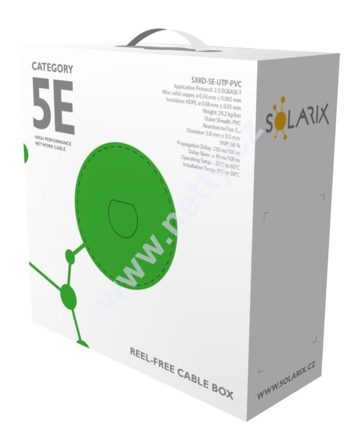 Tento instalační kabel Solarix s označením SXKD-5E-UTP-PVC je spolehlivý nestíněný kabel kategorie 5E určený pro provoz Ethernetových protokolů, včetně 2.5GBASE-T a 5GBASE-T*. Konstrukce kabelu je U/UTP, typ pláště PVC s třídou reakce na oheň Eca. Vodiče kabelu jsou vyrobeny z kvalitního měděného drátu s čistotou mědi 99,97%. Kabel bez problémů splňuje požadavky z mezinárodních standardů ISO/IEC 11801, EN 50173 a ANSI/TIA 568.2-D. V případě CPR (nařízení EU č. 305/2011) je kabel testován u nezávislé laboratoře FORCE TECHNOLOGY v systému posuzování vlastností AVCP 3. Stejně jako ostatní kabely Solarix, je i kabel SXKD-5E-UTP-PVC značen metráží po 1 m v rozsahu od 0 do 100 m. Kabel je dodáván ve vysoce odolném třívrstvém leštěném kartónovém boxu (vždy barevně odlišeném podle typu kabelu), na kterém jsou uvedeny všechny nezbytné produktové informace, včetně čárových kódů, výrobní šarže, popisu a nejdůležitějších technických parametrů.
