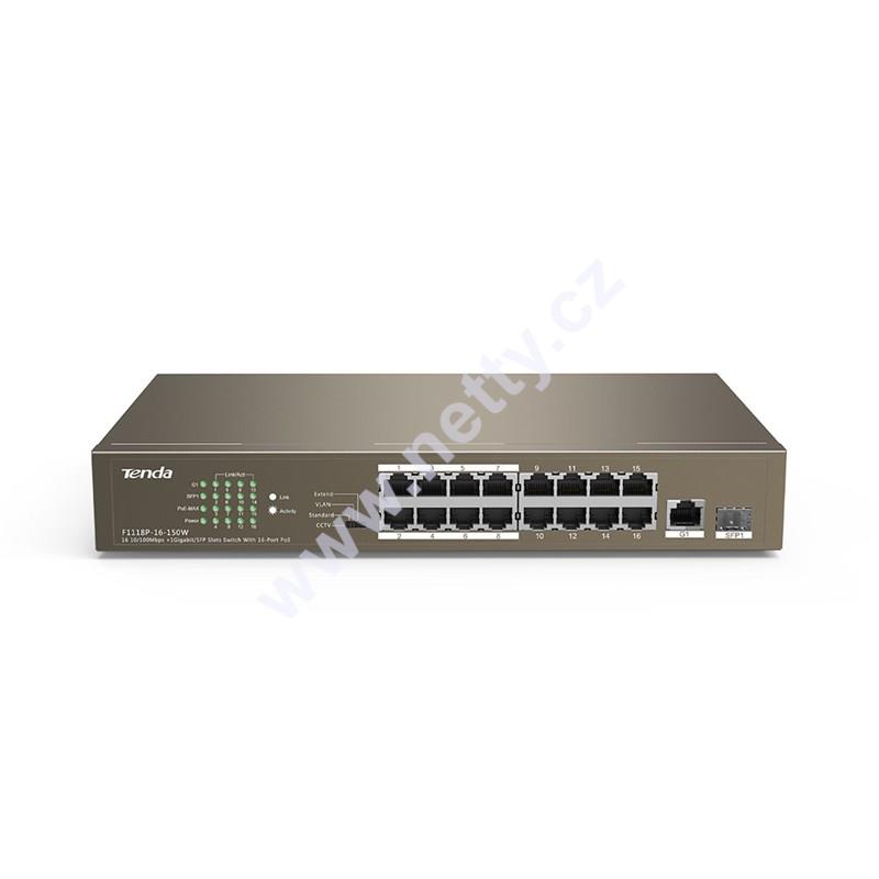 Tenda TEF1118P-16-150W přepíná data pomocí 17ti portů RJ45/SFP, 16 portů 10/100 Mb/s podporuje PoE802.3af/at + 1 Combo port pro Uplink (buď 1xRJ45 10/100/1000 Mb/s nebo 1xSFP 100/1000 Mb/s). Switch má ochranu proti přepětí 6kV. Podpora přepojování uzlů v módu Store-and-Forward a Cut-throught. Full-duplex kontrola toku 802.3x, half-duplex kontrola toku v režimu Back-Pressure.