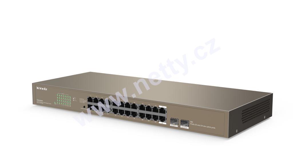 Tenda TEG1024F je 24ti portový Gigabitový Ethernet switch s 2x SFP sloty. 22 portů 10/100/1000 Mb/s + 2x Combo SFP/RJ45 1000 Mb/s. Fanless, bez ventilátorů. Rackmount, velikost switche 19". Ochrana proti přepětí 6 kV. Přepínání VLAN, Aggregation, Flow Control, Standart. Kovový obal.