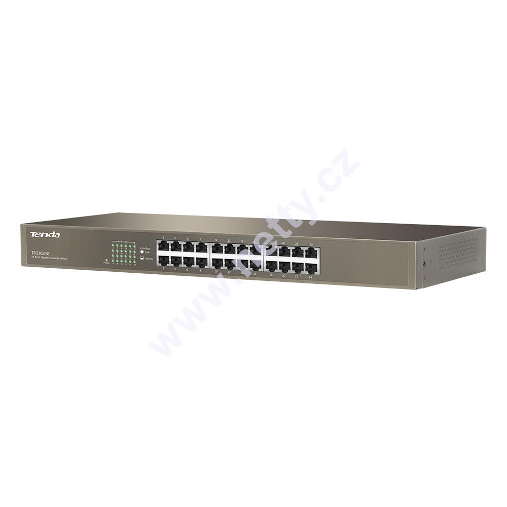 Tenda TEG1024G přepíná data pomocí 24 portů RJ45 s přenosovou rychlostí 10/100/1000 Mb/s s automatickou detekcí rychlosti. Switch disponuje ochranou proti přepětí 6000 V. Podpora přepojování uzlů v módu Store-and-Forward. Full-duplex kontrola toku 802.3x, half-duplex kontrola toku v režimu Back-Pressure. Maximální propustnost 48 Gb/s. Balení obsahuje kovové "L" držáky pro montáž do rozvaděče. Switch je napájen interním zdrojem.