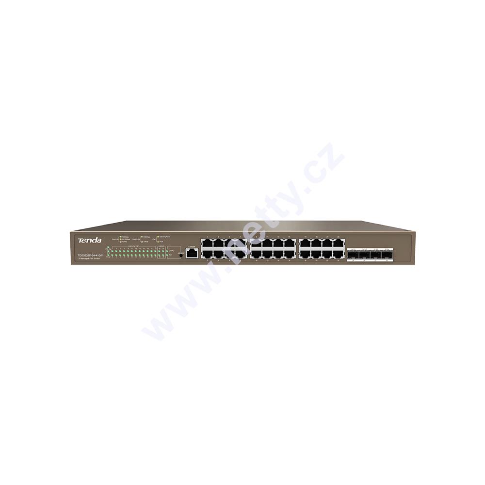 Tenda TEG5328P-24-410W je 24 portový Gigabitový PoE switch s PoE af/at. 24x 10/100/1000 Mb/s PoE 802.3af/at (celkem 370 W) + 4x SFP 1000Mb/s + 1x Console. Layer L3 routing, STP/RSTP/MSTP, IGMP Snooping V1/V2/V3, VLAN, Static+aging ARP, SNMP, ochrana přepětí 6kV, Rackmount. Součástí balení je český, slovenský a polský manuál.