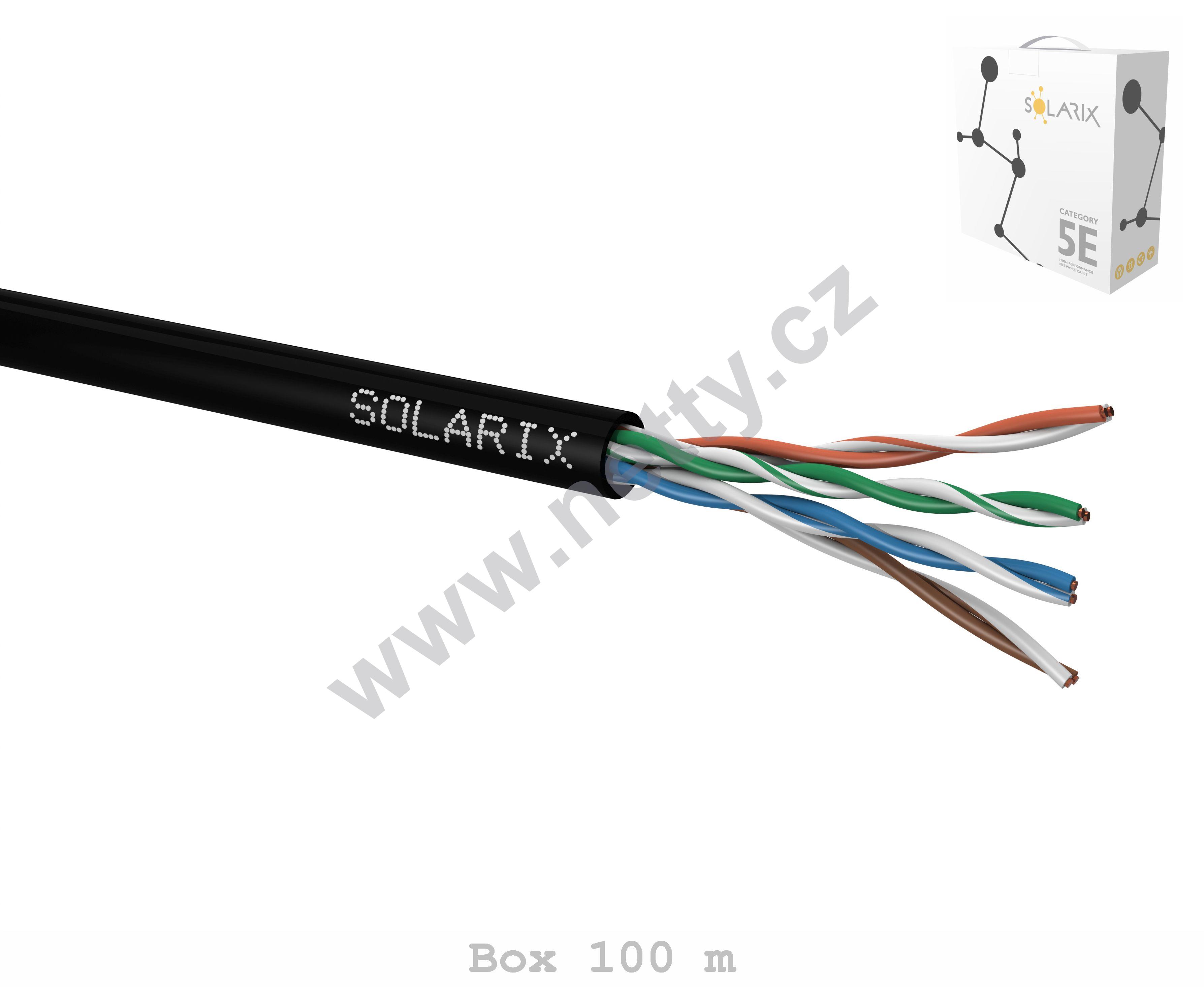 Tento instalační kabel Solarix s označením SXKD-5E-UTP-PE je spolehlivý venkovní nestíněný kabel kategorie 5E určený pro provoz Ethernetových protokolů, včetně 2.5GBASE-T a 5GBASE-T*. Konstrukce kabelu je U/UTP, typ pláště UV stabilní PE s třídou reakce na oheň Fca a stupněm krytí IP67. Vodiče kabelu jsou vyrobeny z kvalitního měděného drátu s čistotou mědi 99,97%. Kabel bez problémů splňuje požadavky z mezinárodních standardů ISO/IEC 11801, EN 50173 a ANSI/TIA 568.2-D. Stejně jako ostatní kabely Solarix, je i kabel SXKD-5E-UTP-PE značen metráží po 1 m v rozsahu od 0 do 100 m. Kabel je dodáván ve vysoce odolném třívrstvém leštěném kartónovém boxu (vždy barevně odlišeném podle typu kabelu), na kterém jsou uvedeny všechny nezbytné produktové informace, včetně čárových kódů, výrobní šarže, popisu a nejdůležitějších technických parametrů. Tento kabel není určen pro trvalé uložení do vody ani do země bez odpovídající řádné ochrany.